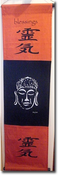 Rastafarian blessings with hand cut print of Buddha. Hanging scroll. Comes in mixed background colors. 12 " x 48".- www.reggaeworldhawaii.com